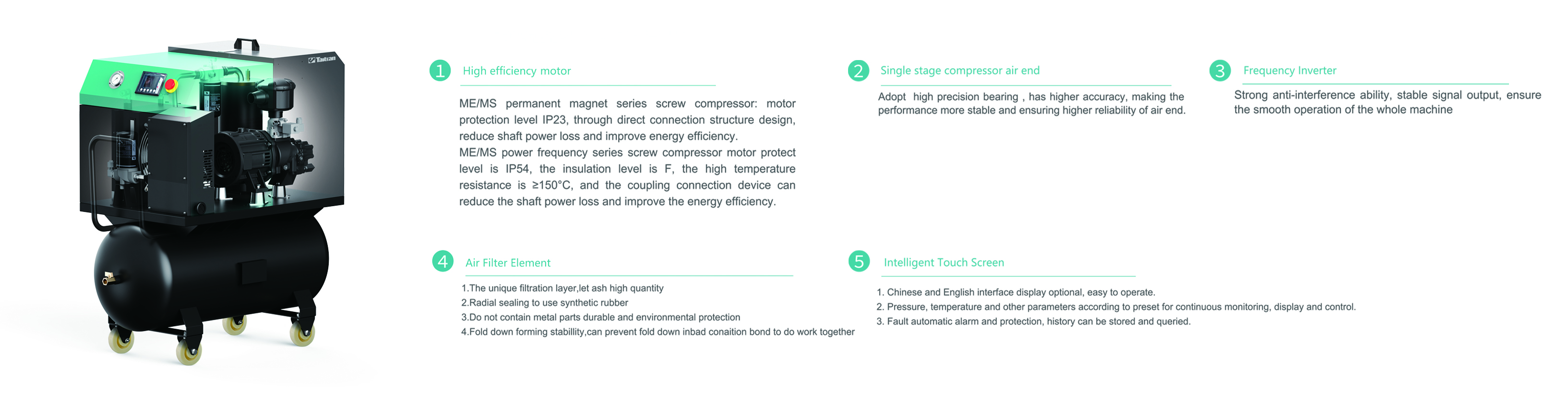 1 ) Low-cost, economical, Single stage civil screw compressor; 2 ) Multi air duct intake, suitable for various working conditions;